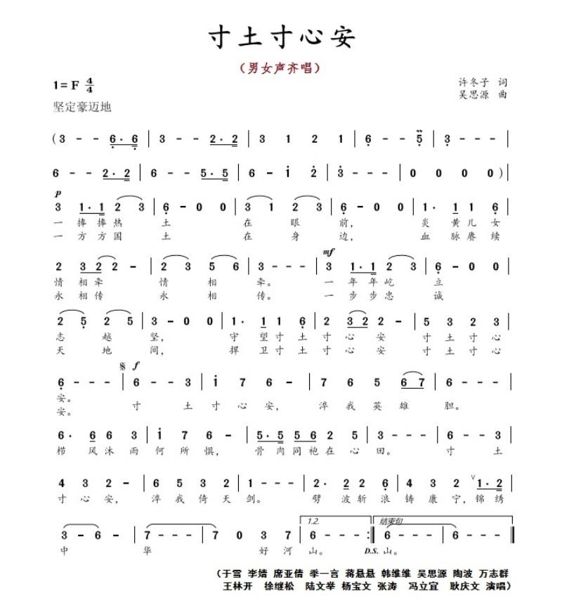 据悉,《寸土寸心安》由阜阳市音协主席许冬子作词,淮北市音舞协副主席吴思源作曲,淮北音乐人万帅编曲,于雪、李婧、席亚倩、陶波等两市十余名优秀青年歌唱演员倾情演唱。歌曲立意聚焦国家安全内核,旋律庄重深情、铿锵有力,字字镌刻山河挚爱、句句饱含守护初心,生动诠释华夏儿女寸土必守、家国同心的赤诚信仰。